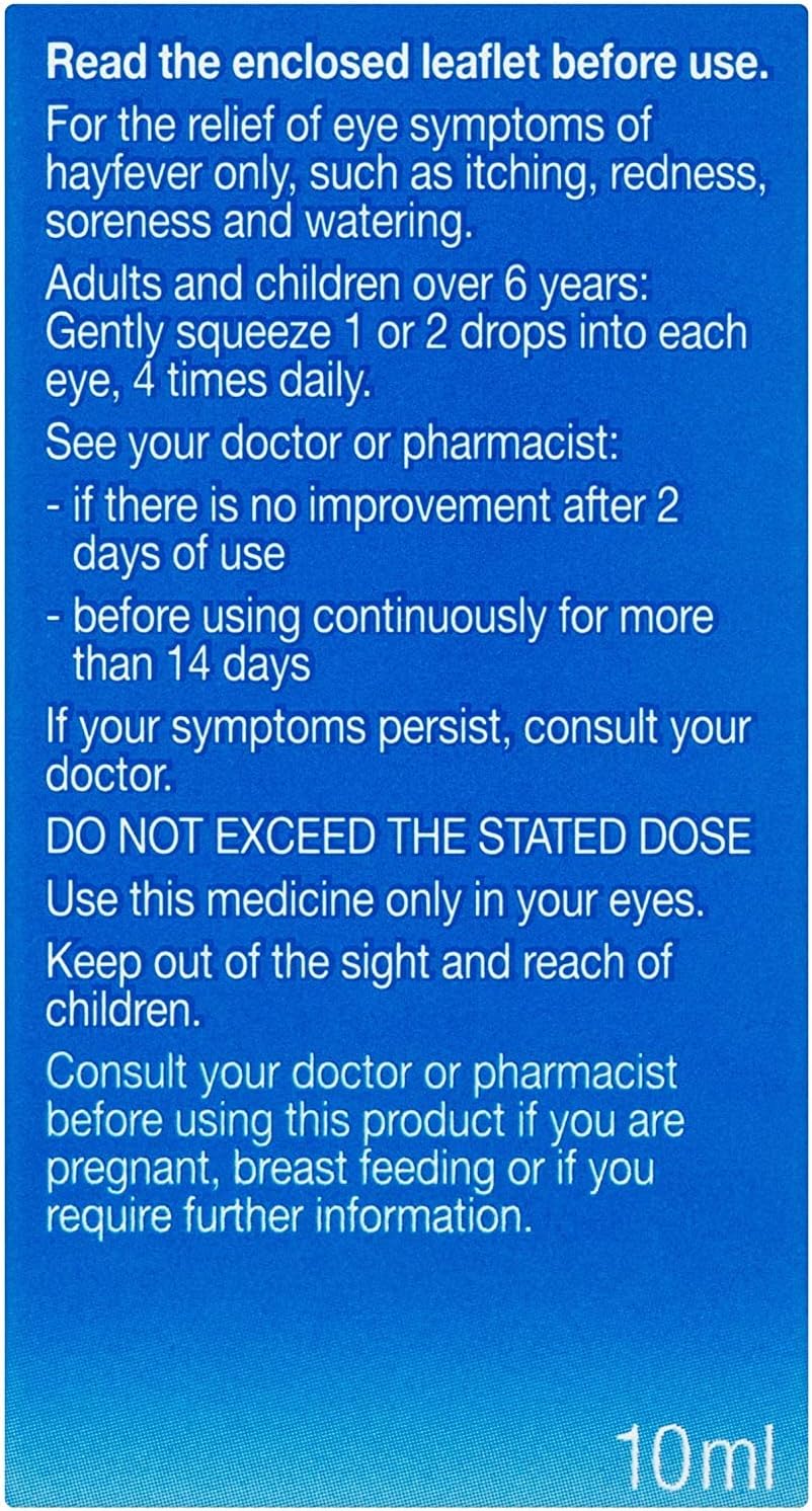 Introducing Optrex Hayfever Relief 2% Eye Drops, a soothing solution for itchy eyes due to allergies. This 10ml bottle provides effective relief from symptoms exacerbated by pollen, pet hair, and dust mites, helping prevent further discomfort. Experience soothing relief from itching, redness, soreness, and watering of the eyes caused by hay fever. Simply administer one or two drops into each eye, up to four times daily, for optimal relief. Suitable for everyday use, these allergy eye drops offer comfort and ease for irritated eyes.