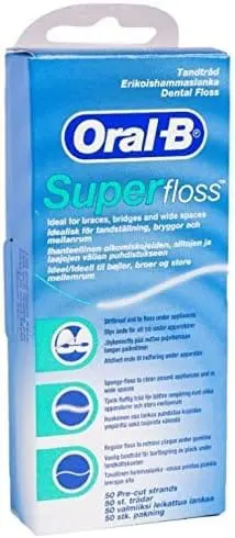 Oral-B Super Floss Mint, available in a convenient pack of 50 pre-cut pieces, is specifically designed for individuals with braces, bridges, and wider spaces between teeth. Clinically proven to combat gum disease, this innovative floss offers three benefits in one product.